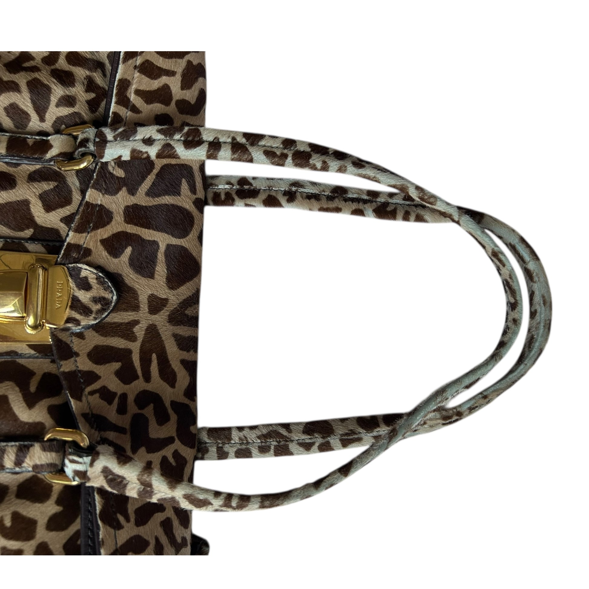 Prada Giraffe-Print Cavallino Shoulder Bag (also described as a tote or handle bag), made from calf hair with a distinctive animal print pattern. The bag features a push-lock closure and gold-tone hardware, including buckle details on the front straps.