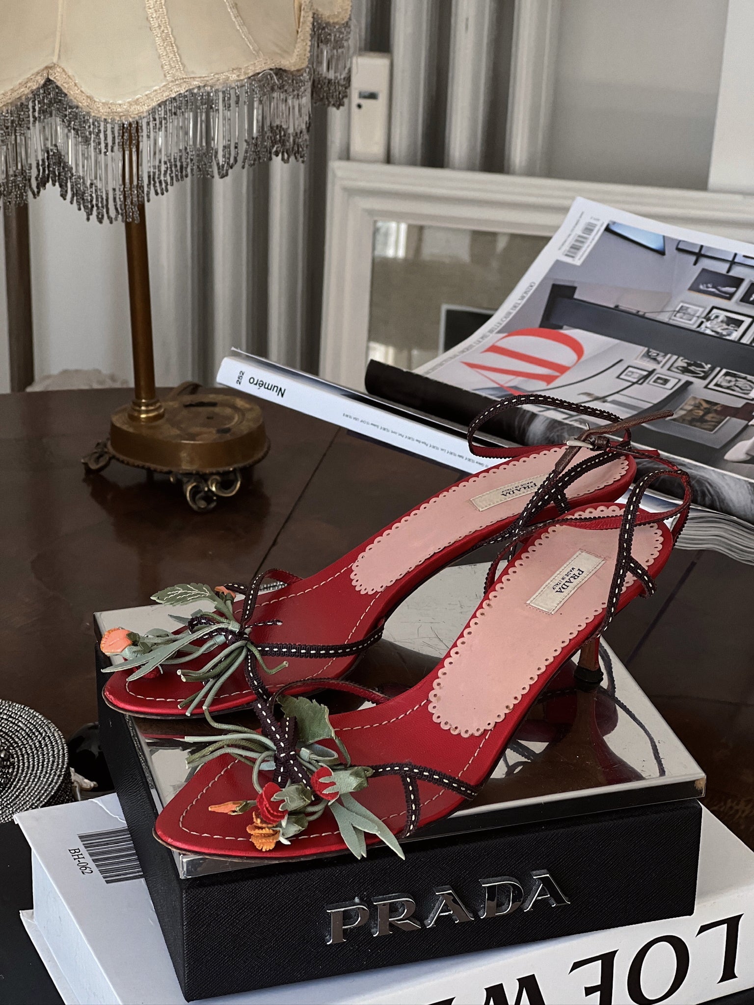 Vintage Prada floral appliqué red sandal heels / 37